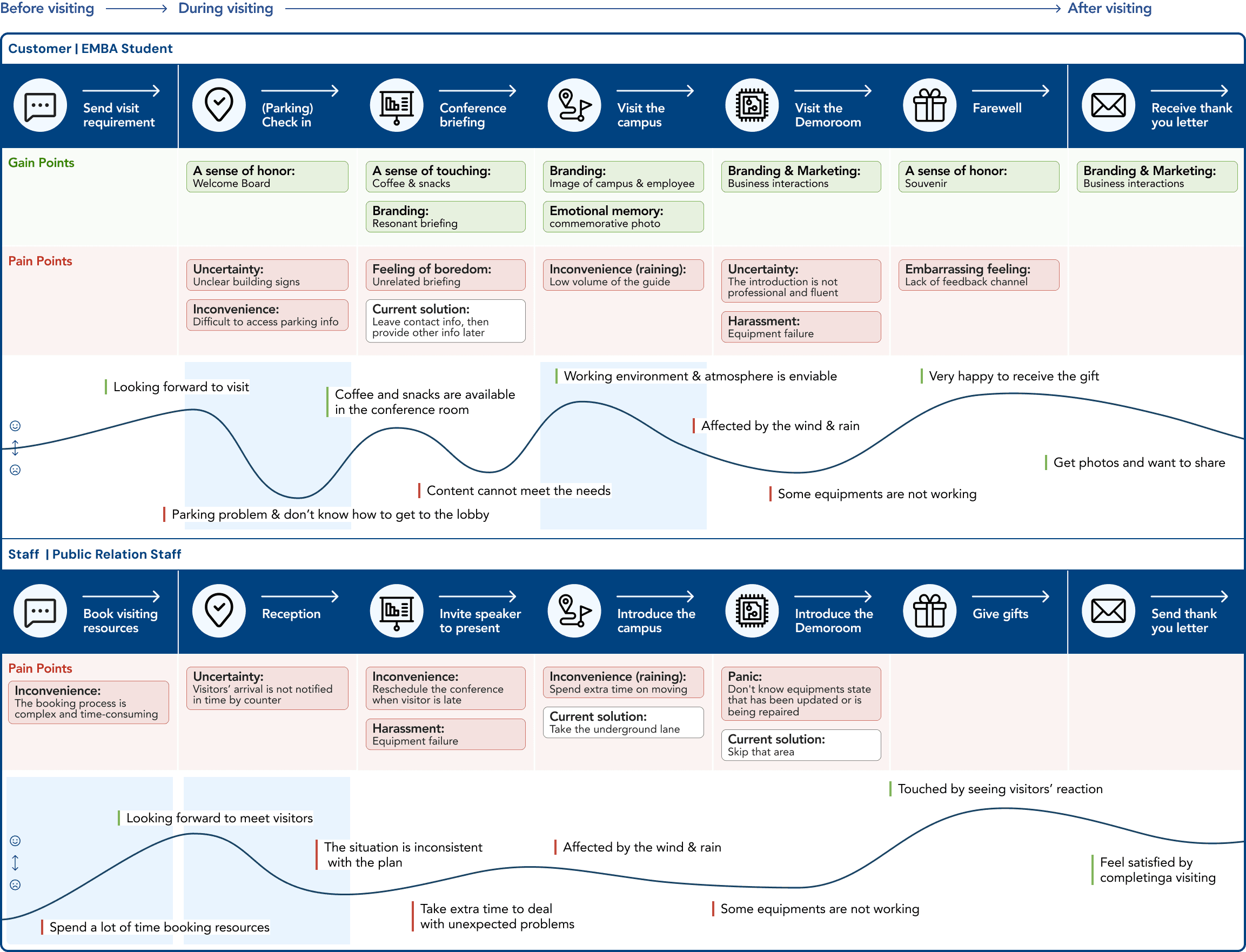 The journey map reveals how staff challenges—booking inefficiencies, delays, and equipment issues—disrupt the visitor experience, causing confusion and inconvenience.