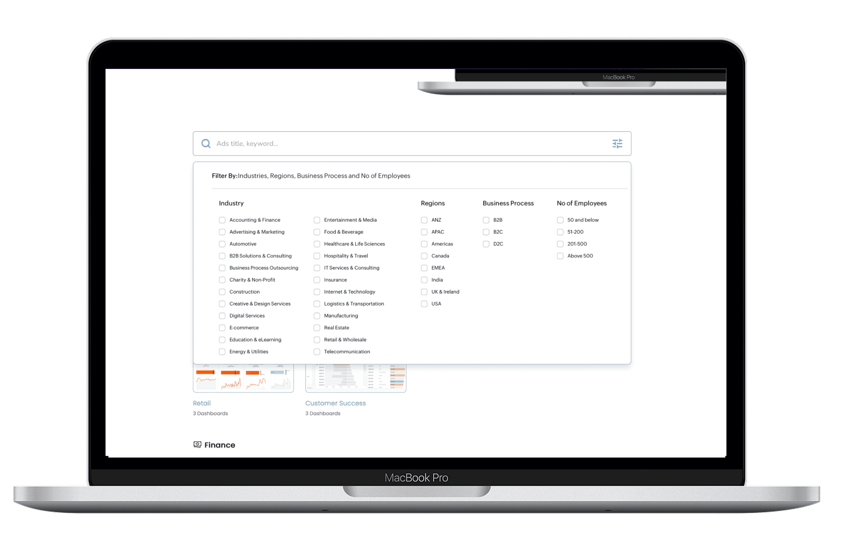 To improve content discoverability and help users efficiently locate dashboards relevant to their field, I recommend implementing a search filter system. Currently, users face difficulty navigating broad and often ambiguous category labels like “Commercial” or “Finance,” which don’t always align with how they define their own roles or sectors. This results in speculative browsing.