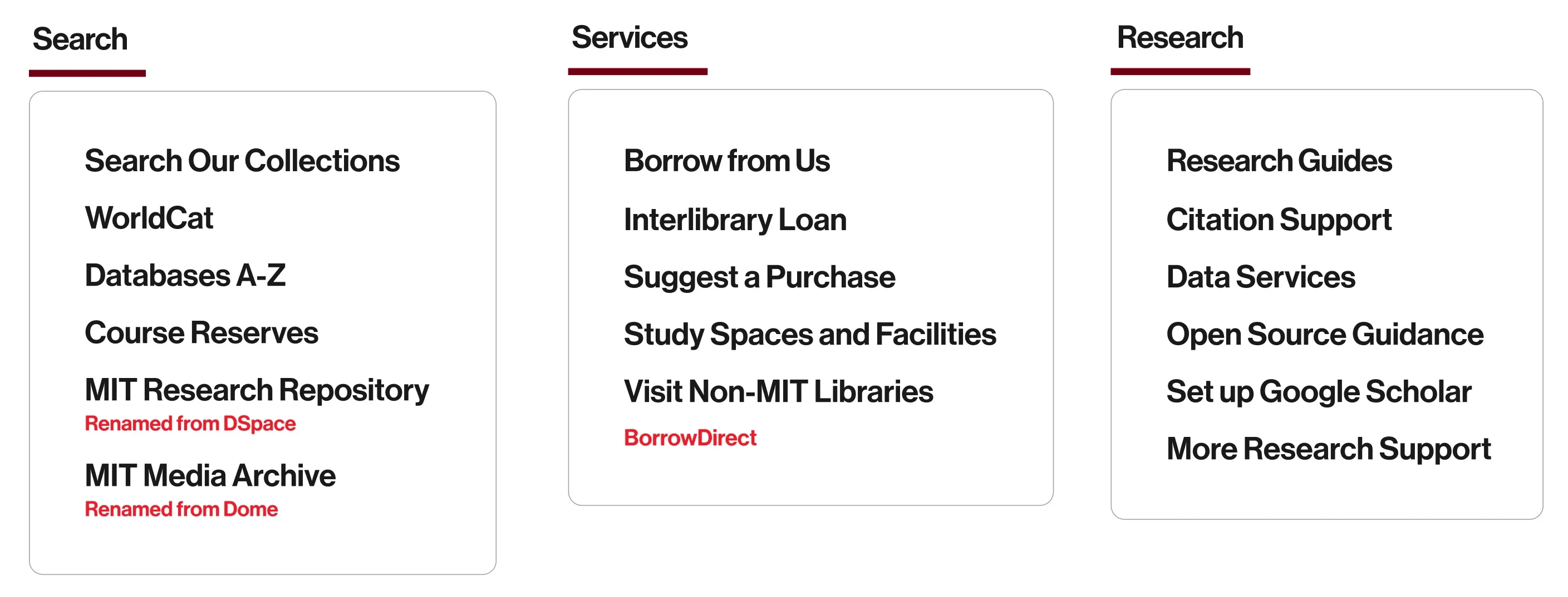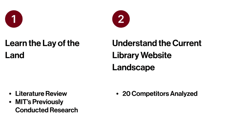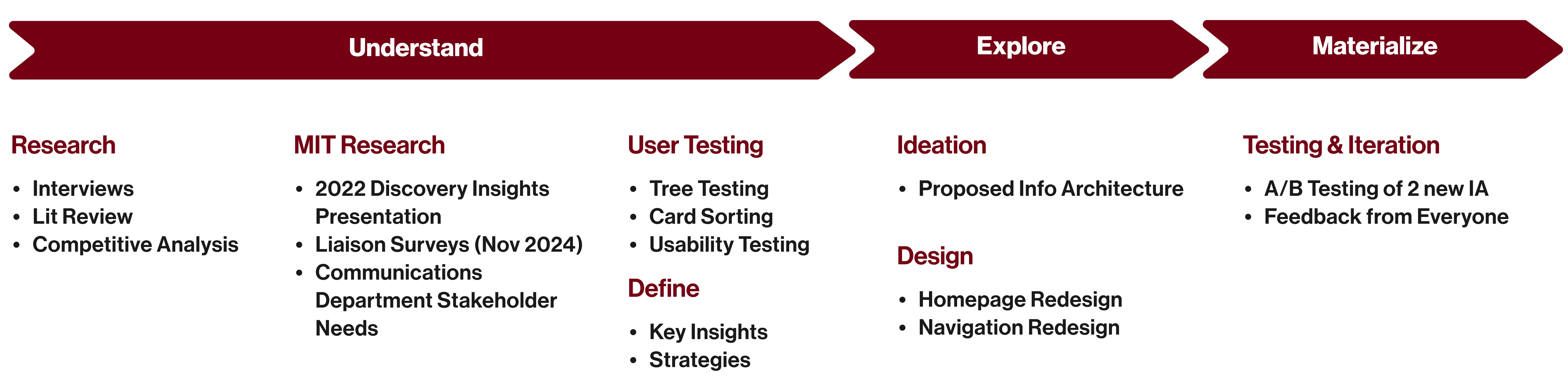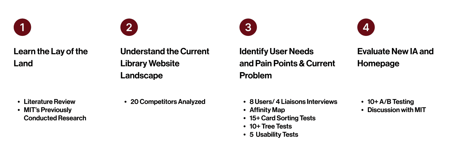 In January 2025, our team partnered with MIT Libraries to redesign the homepage and information architecture of their research-heavy website. Internal feedback showed that students, faculty, researchers, and staff were overwhelmed by the navigation and search tools. Our goal was to validate these issues through user research and propose strategic redesigns that could lay the foundation for a long-term, campus-wide website transformation.
