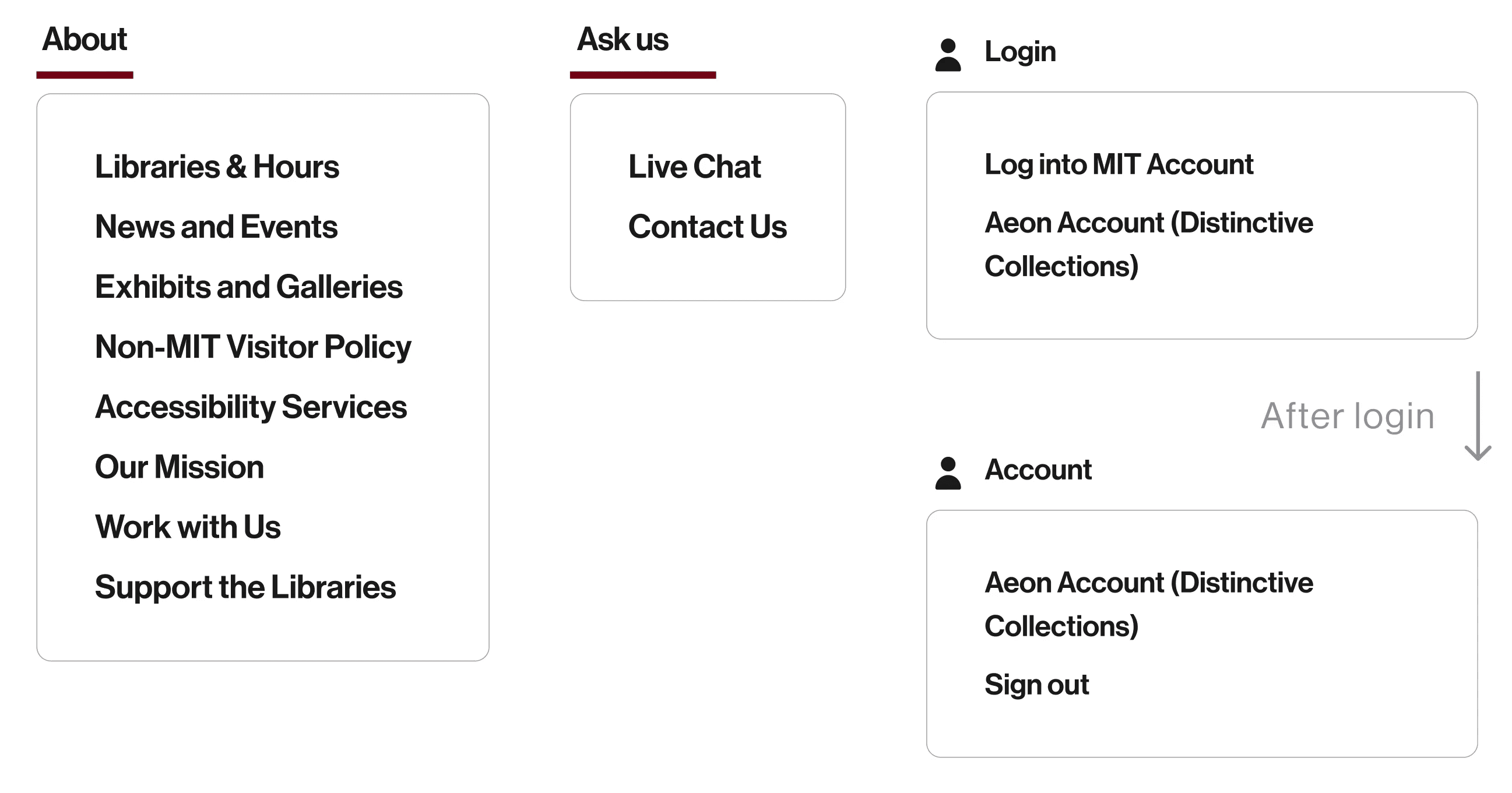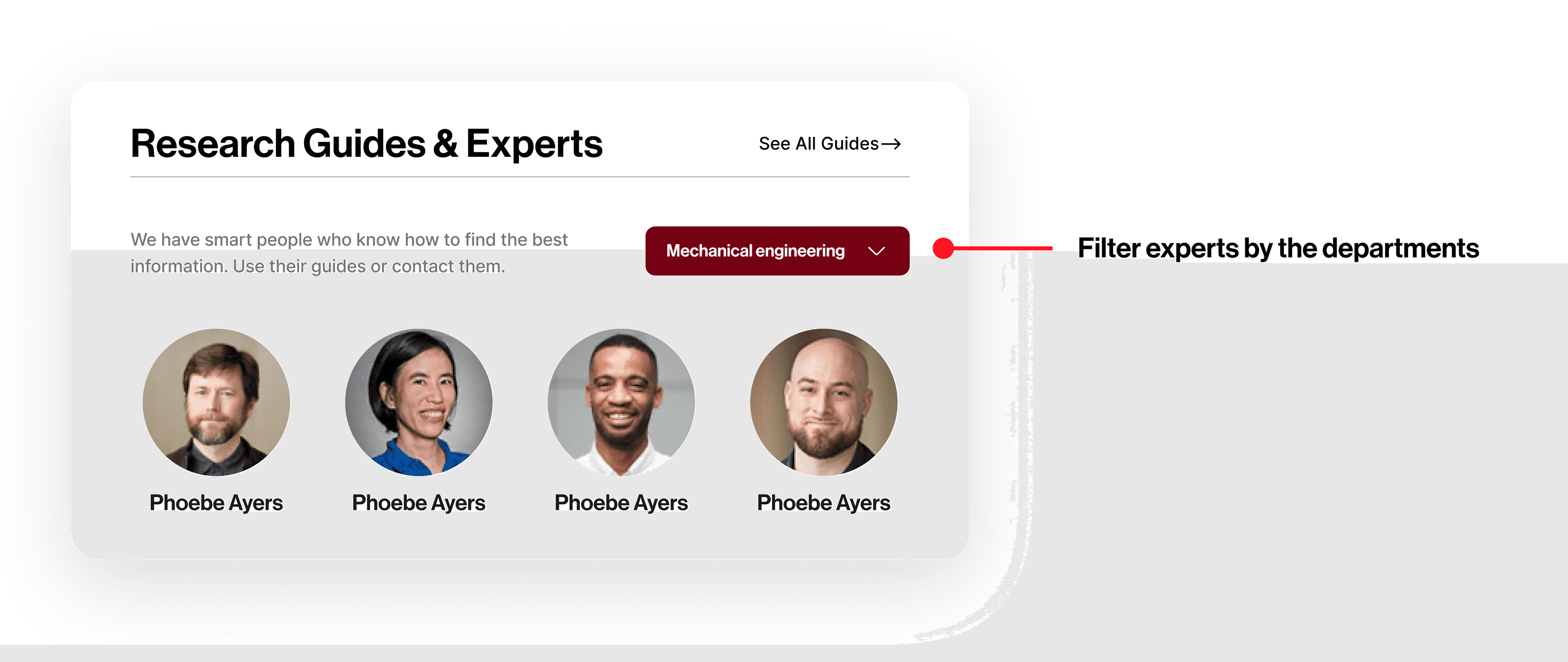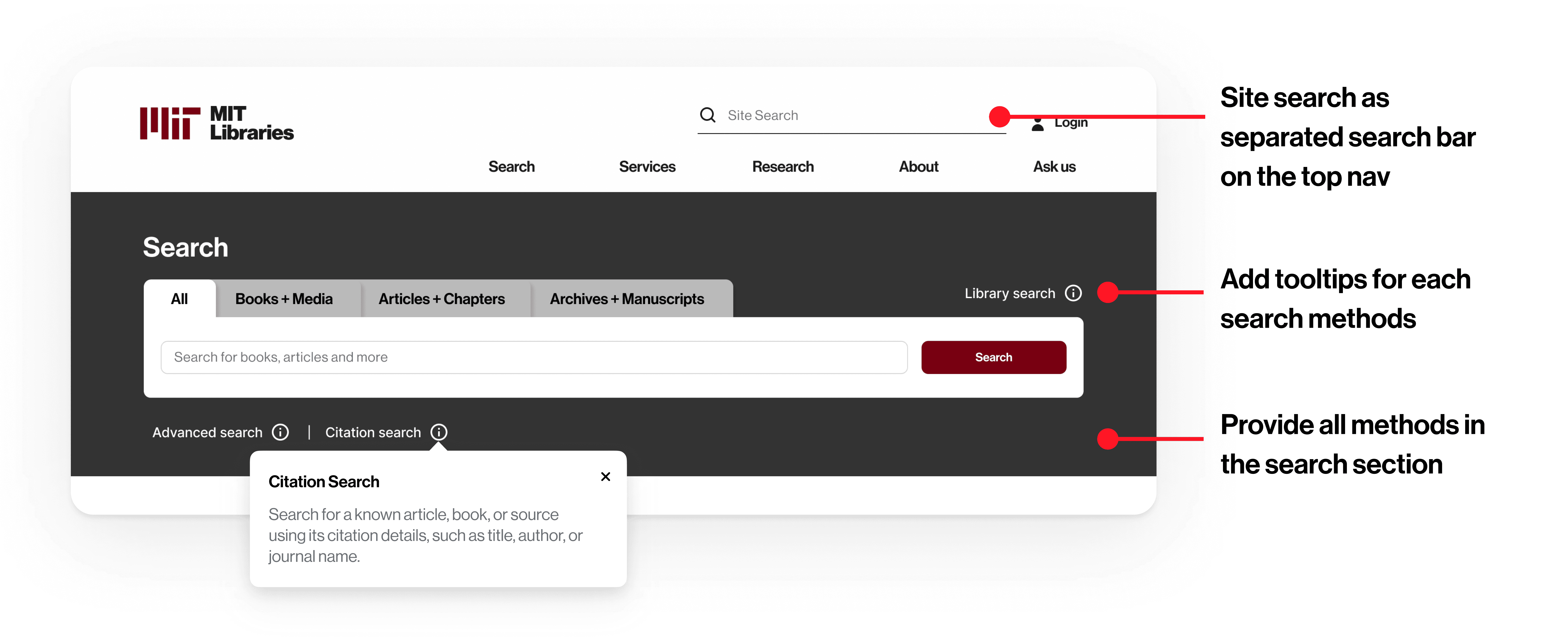 Our initial designs sparked valuable feedback from the MIT Libraries team. They appreciated the variety across all four concepts—especially our different approaches to search (site vs. catalog) and pathways to services or research experts.