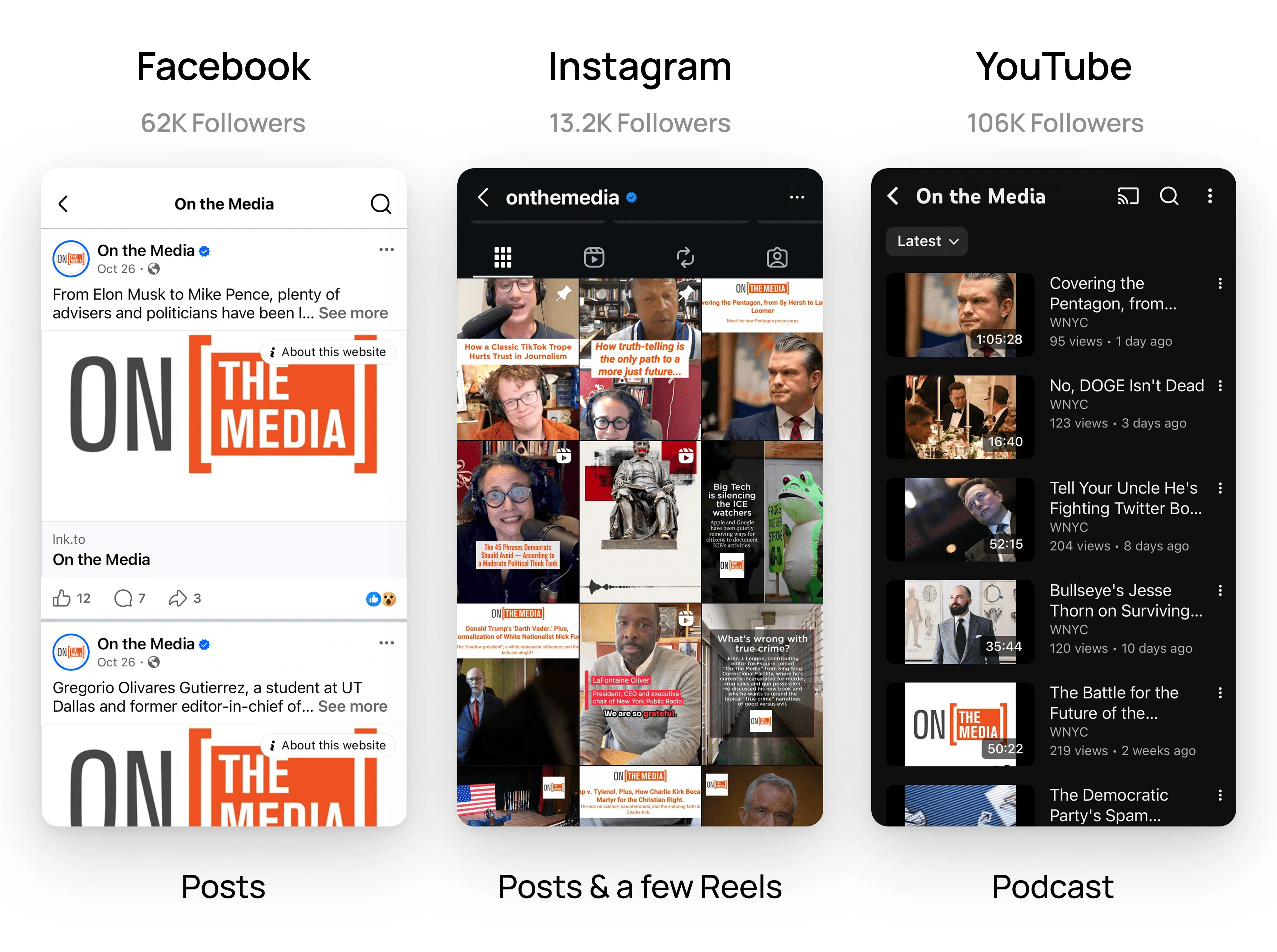 To define OTM's unique digital niche, we analyzed the content strategies of its parent and sibling organizations, NPR (national) and WNYC (local/regional). This clarified the market gaps OTM could fill.
