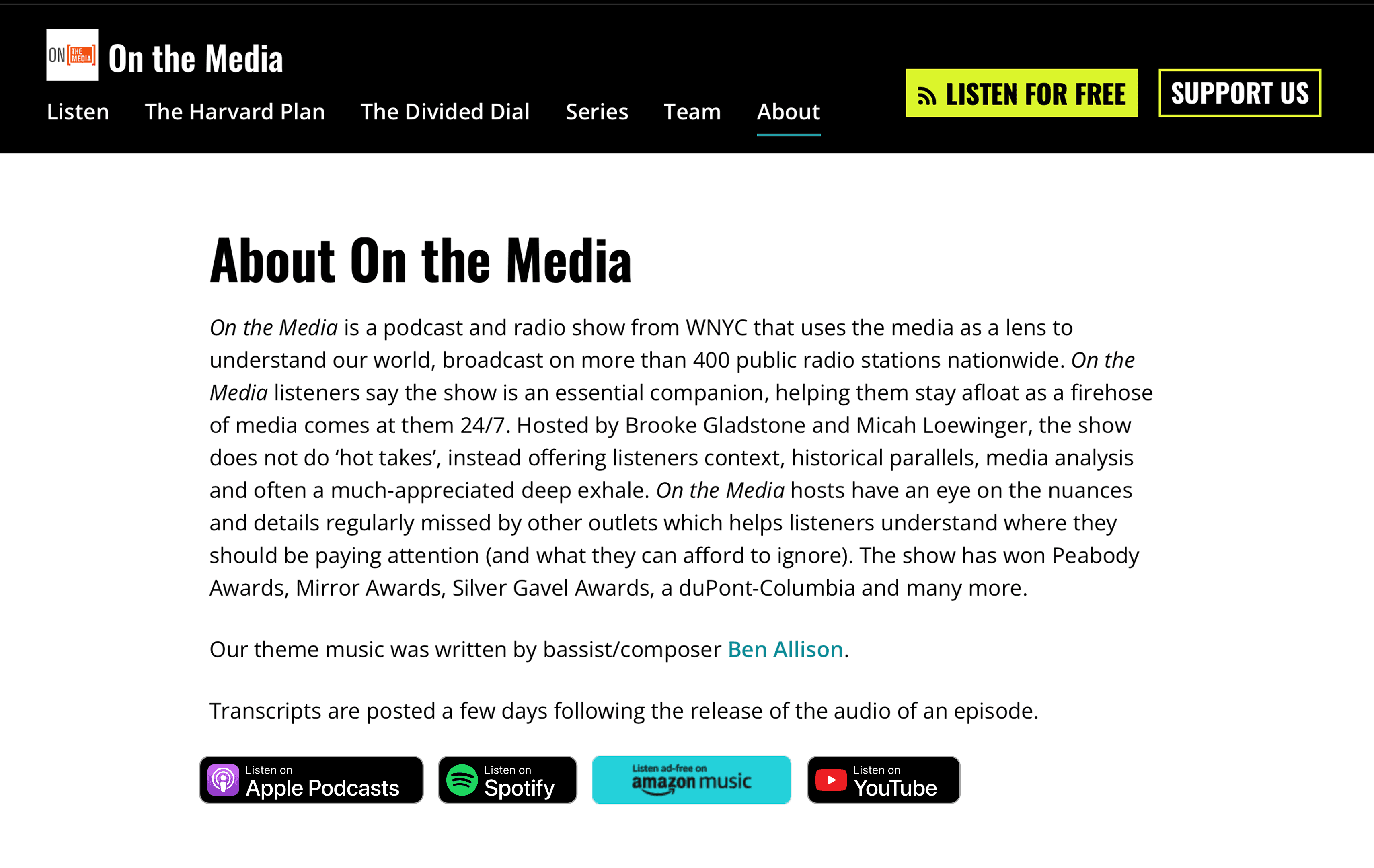 Mention major podcast platforms (Apple Podcasts, Spotify, YouTube) to access OTM's podcasts on their about page. Therefore, the audience can listen to the podcast on their preferred platforms.
